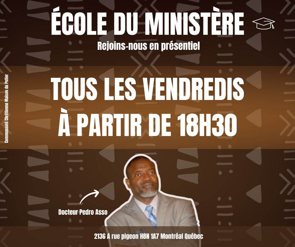 Rejoignez-nous chaque vendredi à partir de 18h30 au Siège CCMP pour l’École du Ministère avec le Docteur Pedro Asso Officiel! Venez partager la sagesse et la lumière de la Parole de Dieu avec nous.